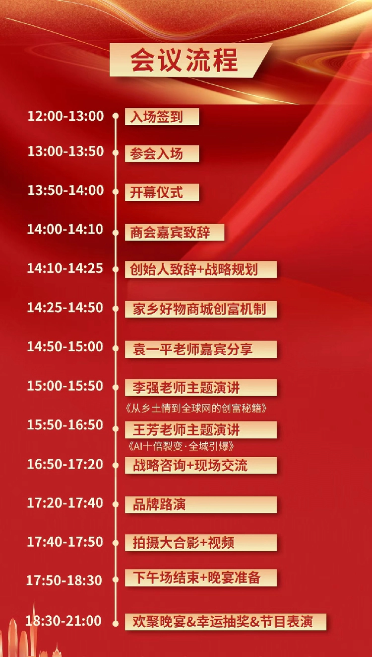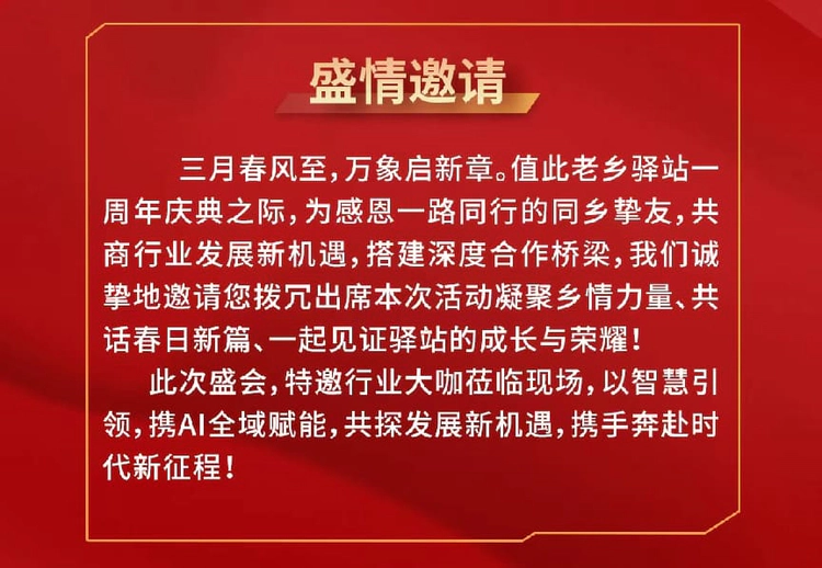 3月29日,以“乡情聚势生态共赢”为主题的500人老乡驿站一周年庆典暨家乡好物商城创富峰会、AI十倍裂变全域引爆赋能会,将在杭州博悦嘉酒店盛大启幕。本次大会以安徽、河南老乡为核心纽带,面向全国所有异乡奋斗者开放,聚焦AI技术赋能与私域电商创新,打造一场老乡帮老乡、共赴共同富裕的行业盛会,现诚邀全国异乡创业者、企业家报名参会,共话乡情、共探商机、共创未来。